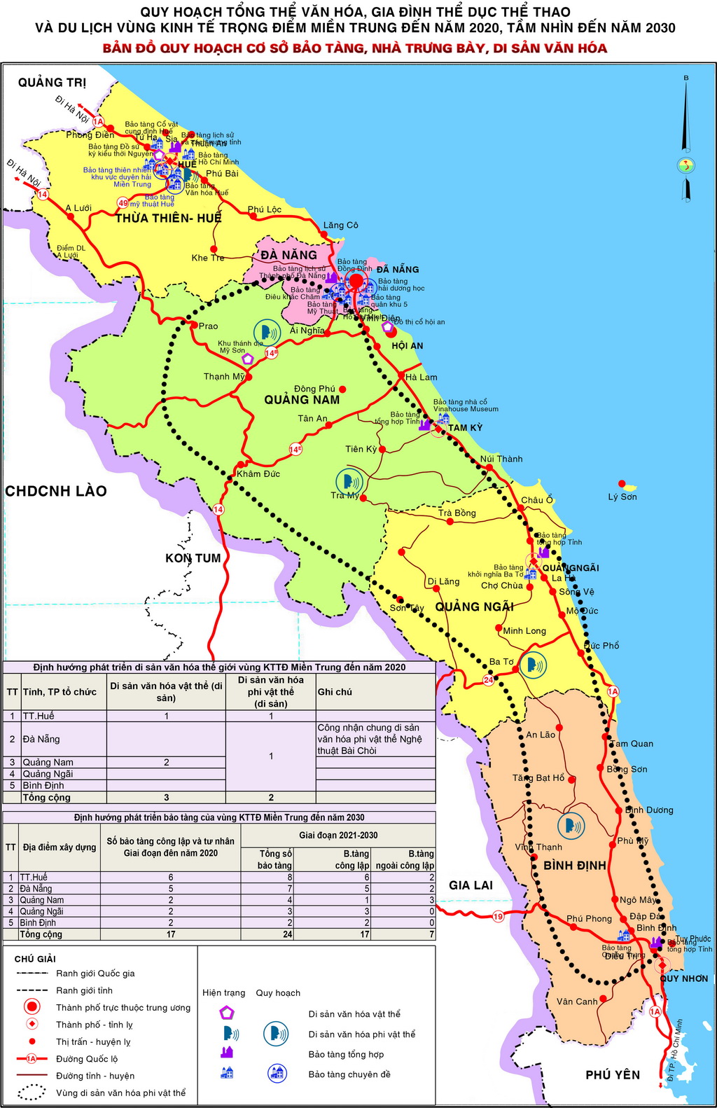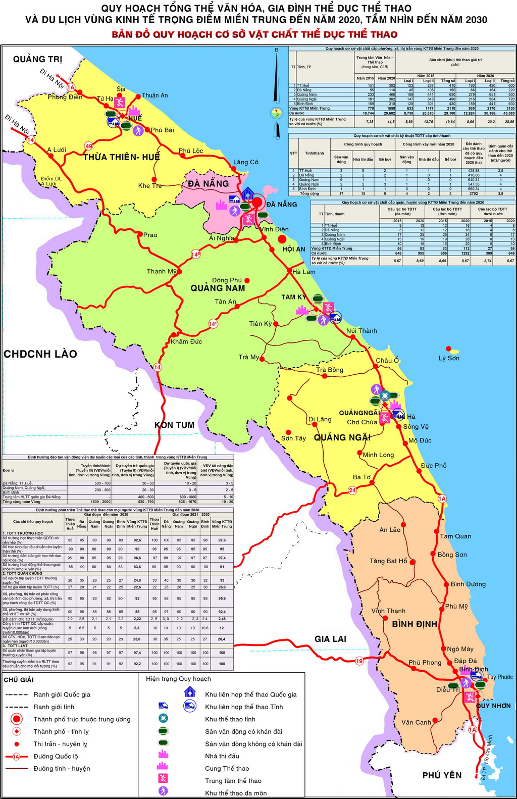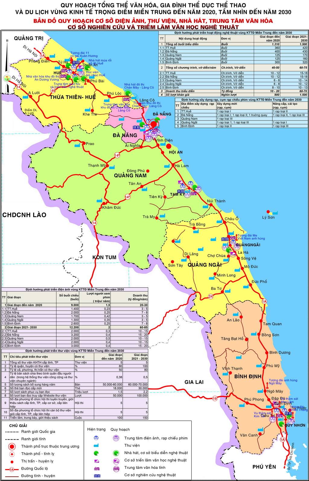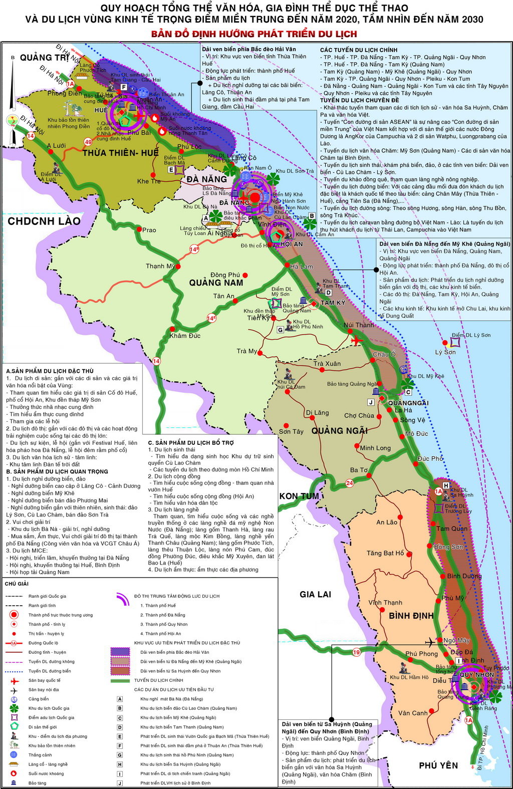 Quy hoạch tổng thể phát triển văn hóa, gia đình, thể dục thể thao và du lịch vùng KTTĐ Miền Trung đến năm 2020, tầm nhìn đến năm 2030 được phê duyệt tại Quyết định số 2054/QĐ-TTg, ngày 13/11/2014 xác định phát triển văn hóa theo hướng toàn diện, tiên tiến, đậm đà bản sắc dân tộc; xây dựng gia đình văn hóa, hòa thuận, hạnh phúc; phát triển sâu rộng thể dục thể thao quần chúng, chú trọng vùng đồng bào dân tộc thiểu số; phát triển du lịch theo hướng chuyên nghiệp, hiện đại, hình thành những sản phẩm du lịch biển đảo và du lịch di sản có thương hiệu, sức cạnh tranh cao. Theo quy hoạch, TP Đà Nẵng, TP Huế sẽ trở thành trung tâm văn hóa, nghệ thuật của khu vực; hướng tới phát triển thành các trung tâm du lịch mang tầm quốc tế với các sản phẩm đặc thù, có sức cạnh tranh cao như: Du lịch di sản và du lịch biển đảo, ưu tiên phát triển sản phẩm du lịch gắn với sự kiện, lễ hội, văn hóa lịch sử, tâm linh, du lịch nghỉ dưỡng, sinh thái biển.