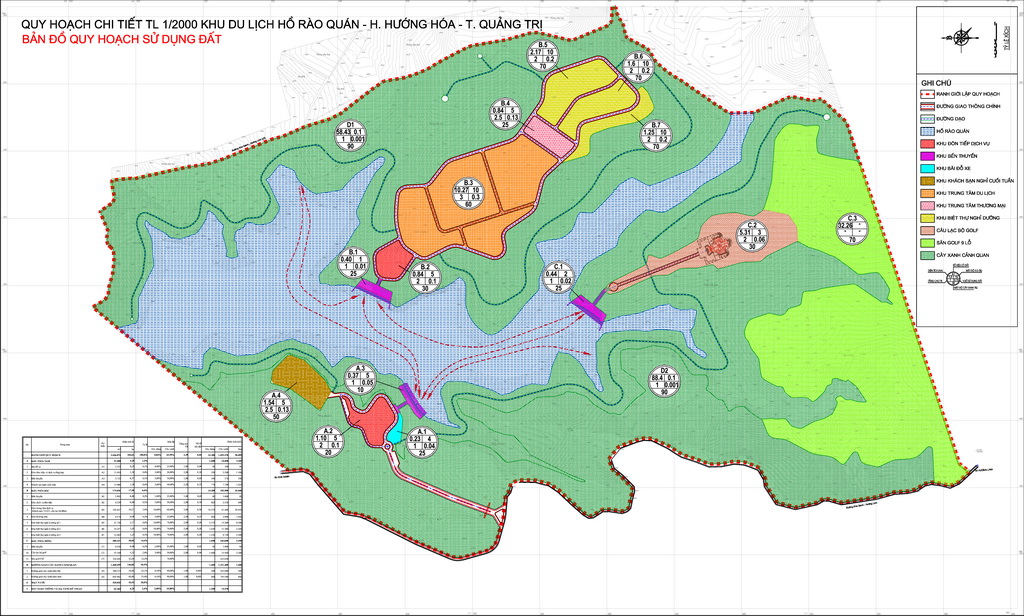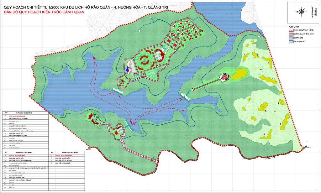 Định hướng phát triển khu du lịch sinh thái hồ Rào Quán thành 4 khu chức năng chính: Khu phía Nam - không gian đón tiếp, du lịch cuối tuần; Khu vực phía Bắc - không gian du lịch nghỉ dưỡng, dịch vụ vui chơi giải trí cao cấp; Khu vực phía Đông - không gian thể thao cao cấp; Không gian cây xanh cảnh quan.