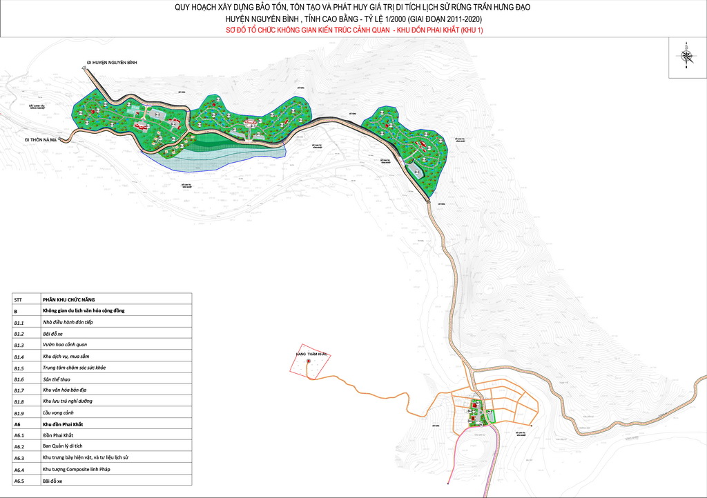Khu di tích lấy không gian cây xanh làm yếu tố chủ đạo, các công trình xây dựng gắn kết với hệ thống cây xanh,vVị trí đặt công trình kiến trúc tạo điểm nhấn tập trung vào các khu vực có cảnh quan đẹp như khu vực giáp ruộng bậc thang, khu vực trên các sườn đồi, khu vực dọc theo các khe suối.